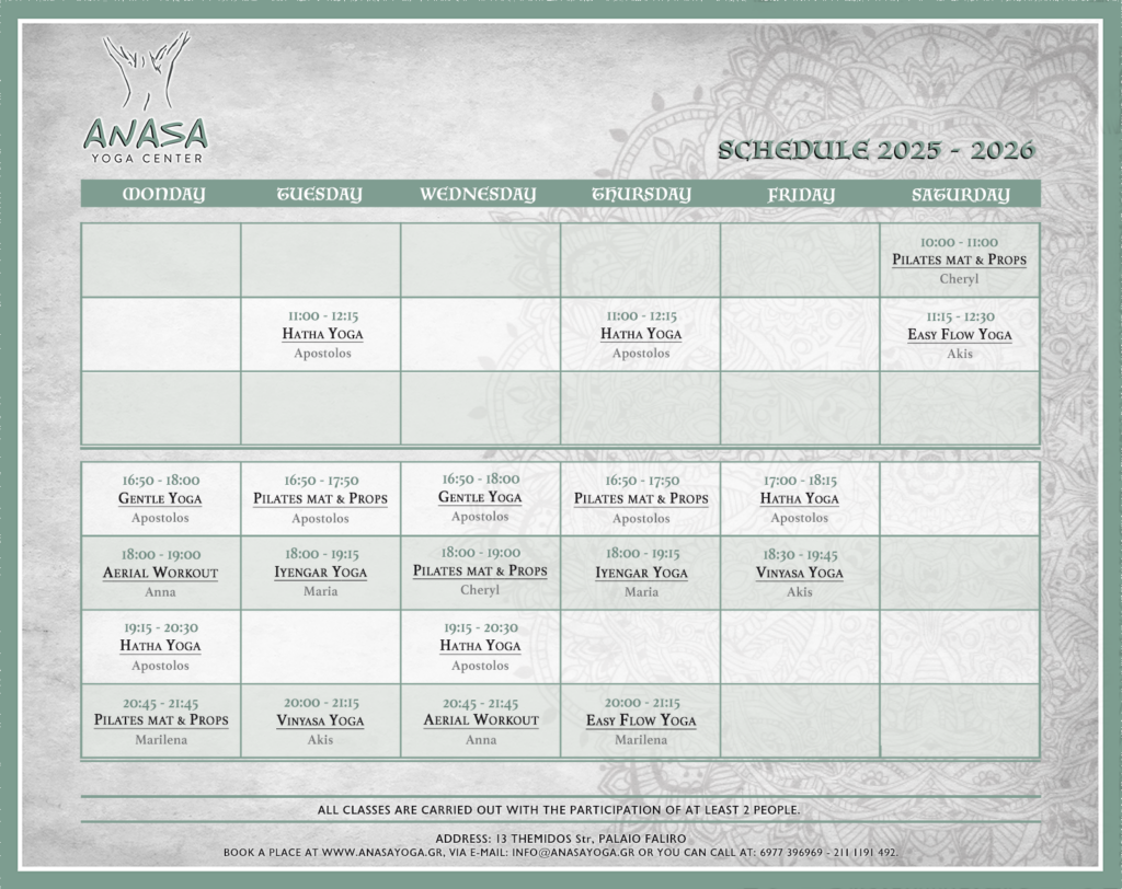 Ηatha Yoga : In these classes, emphasis is placed on the quality and accurate execution of postures. Participants are asked to control the pace of movement and the quality of breathing. Asanas are executed either in a repetitive or a prolonged manner to strengthen and develop awareness of the physical body and more. Equipment (props) is used and pranayama exercises (breathing control) and relaxation techniques are learnt. It is suitable for people with low to moderate physical condition.