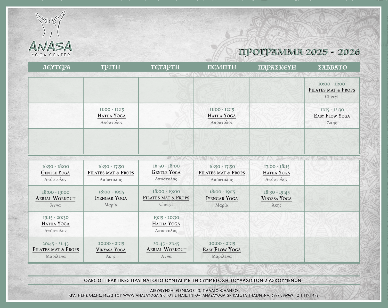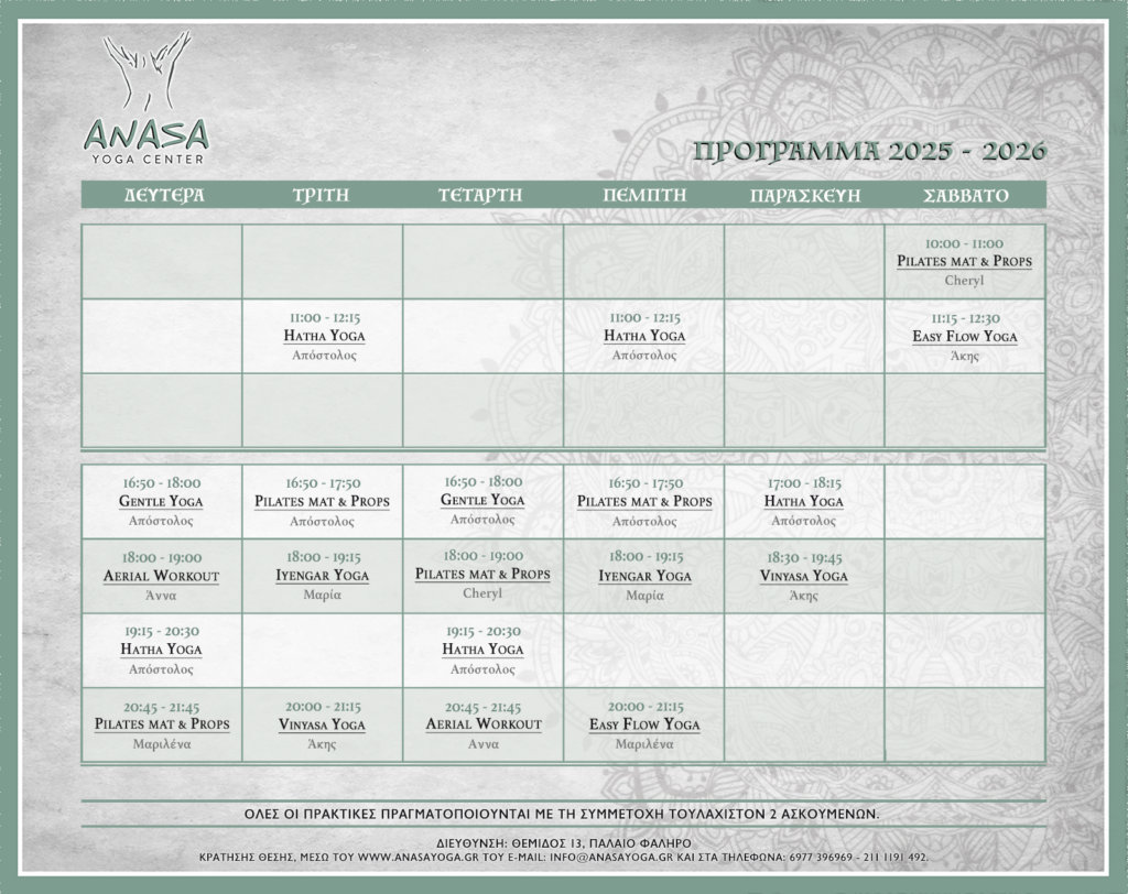 Ηatha Yoga : Σε αυτές τις πρακτικές δίδεται έμφαση στην ποιοτική, ακριβή εκτέλεση των στάσεων. Ο ασκούμενος καλείται να ελέγχει τον ρυθμό των κινήσεων και την ποιότητα της αναπνοής. Άλλοτε επαναλαμβανόμενα και άλλοτε παρατεταμένα, εκτελεί τις άσανες για να δυναμώσει και να αναπτύξει την επίγνωσή του επάνω στο υλικό σώμα και όχι μόνο. Θα χρησιμοποιήσουμε αρκετά το βοηθητικό εξοπλισμό (props), θα μάθουμε ασκήσεις pranayama (έλεγχος αναπνοής) και τεχνικές χαλάρωσης. Απευθύνεται σε ασκούμενους όλων των επιπέδων.